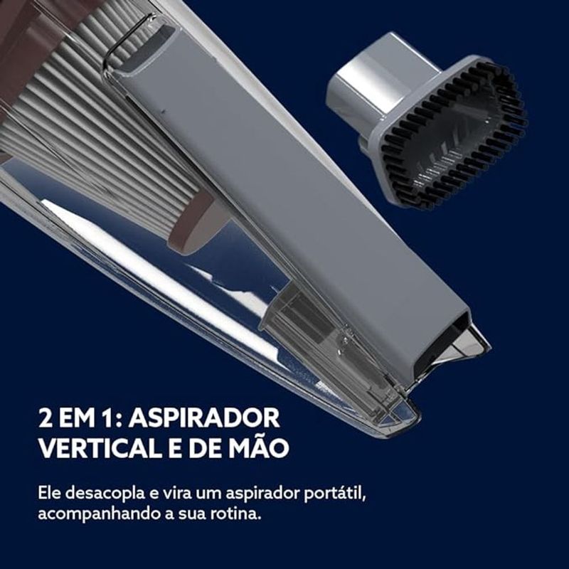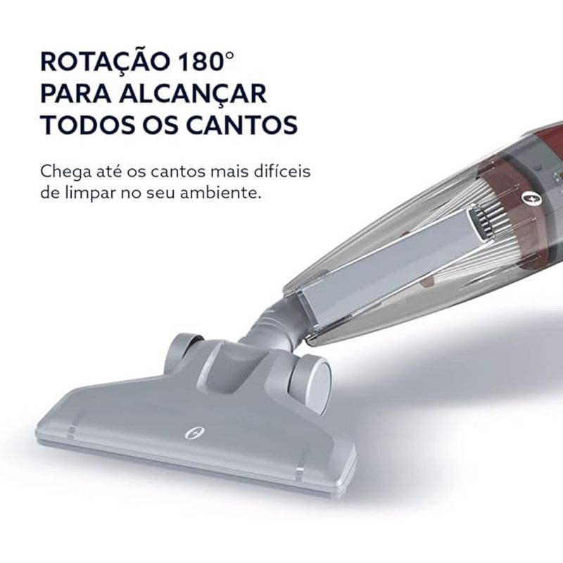 | Diferenciais | Função 2 em 1: Use como aspirador vertical ou de mão, adaptando-se a qualquer superfície; Filtro HEPA: Filtra impurezas e microrganismos, garantindo um ambiente mais saudável para sua família; Sem Saco para Pó: Reservatório de fácil remoção e lavável, gerando mais economia e menos resíduos; Design Compacto: Fácil de guardar, ocupando pouco espaço na sua área de serviço; Acessórios Inclusos: Acompanha bocais específicos para cantos e frestas, ampliando as possibilidades de limpeza. |
