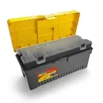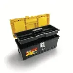 Segurança no transporte: Equipada com uma trava plástica resistente, que assegura o fechamento firme da caixa, protegendo suas ferramentas contra quedas e extravios.