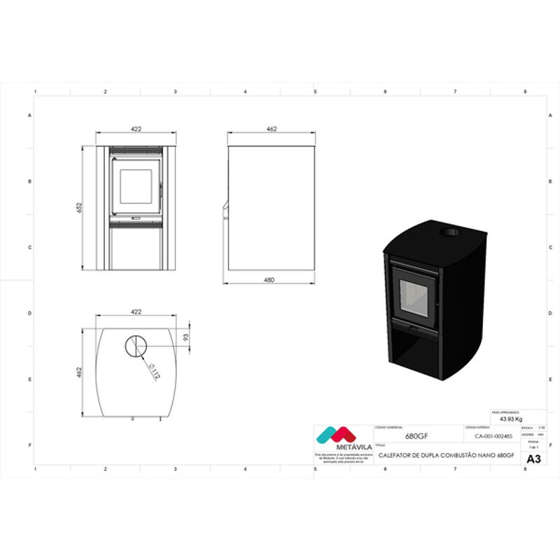 Calefator Metávila 680GF Dupla Combustão Kit Inox Grafite 140m³