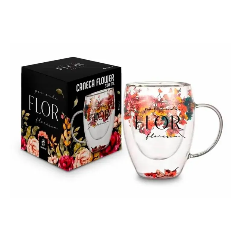 320ml e um design clássico em vidro transparente, ela destaca a beleza da bebida enquanto exibe a estampa exclusiva "Flor e Amor". É a escolha perfeita para quem busca um utensílio funcional que também sirva como um detalhe encantador na decoração da cozinha ou do escritório.