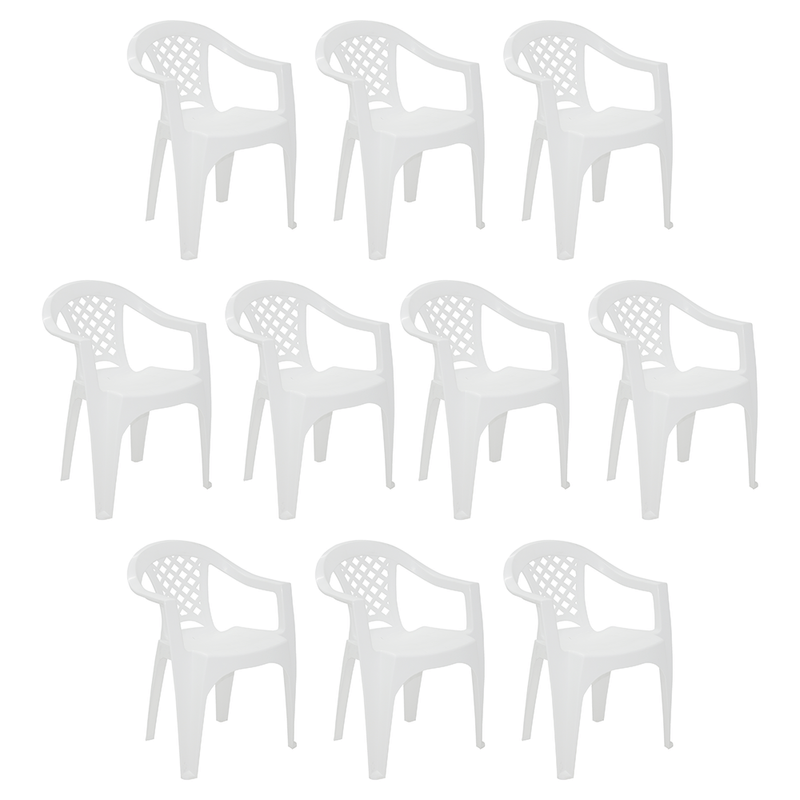 | Diferenciais | Conjunto com 10 cadeiras plásticas com braços, modelo Iguape, na cor branca, fabricadas em polipropileno pela Tramontina. Cada cadeira suporta até 154 Kg. Ideal para ambientes internos ou externos. |