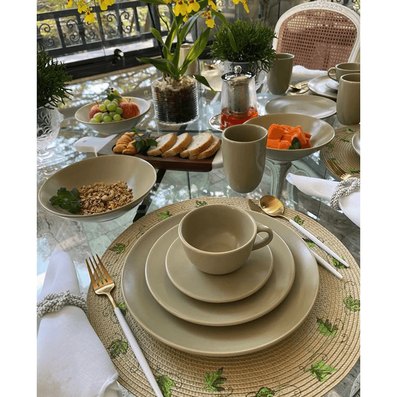 - Com peças em formato discreto, o destaque, é o prato fundo que possui capacidade para 820 ml, ideal para servir sopas e cremes. |