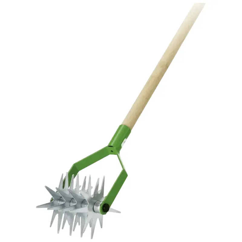 - Corpo de aço com pintura a pó, cabo em madeira maciça e lâminas rotativas de aço;