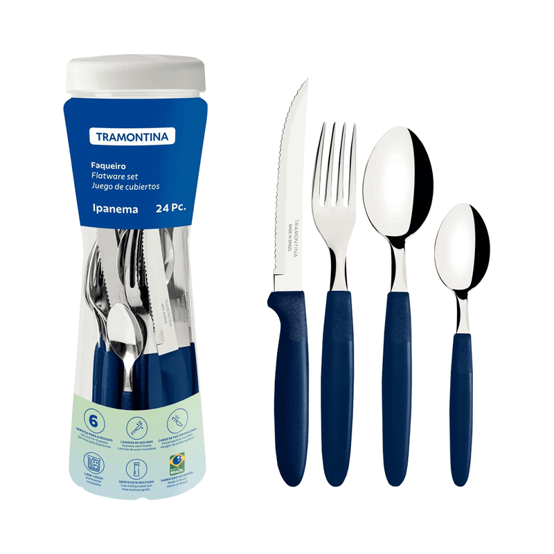 - As lâminas das facas têm maior durabilidade do fio devido ao tratamento térmico. - Os garfos e colheres garantem maior resistência devido a espessura do aço e a estampagem das lâminas. - Os cabos de polipropileno possuem maior resistência e durabilidade. - Podem ir à máquina de lavar louças facilitando seu dia a dia. |