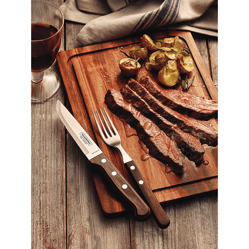 | Diferenciais | Lâminas de aço inox de alta qualidade que garantem resistência e longa vida útil ao faqueiro. Facas com corte eficiente, desenvolvidas para fatiar carnes com precisão, tornando o churrasco mais prático. Cabos em Polywood castanho com design anatômico, proporcionando conforto e segurança no manuseio. Design elegante e acabamento sofisticado que valoriza a apresentação da mesa em qualquer ocasião. |