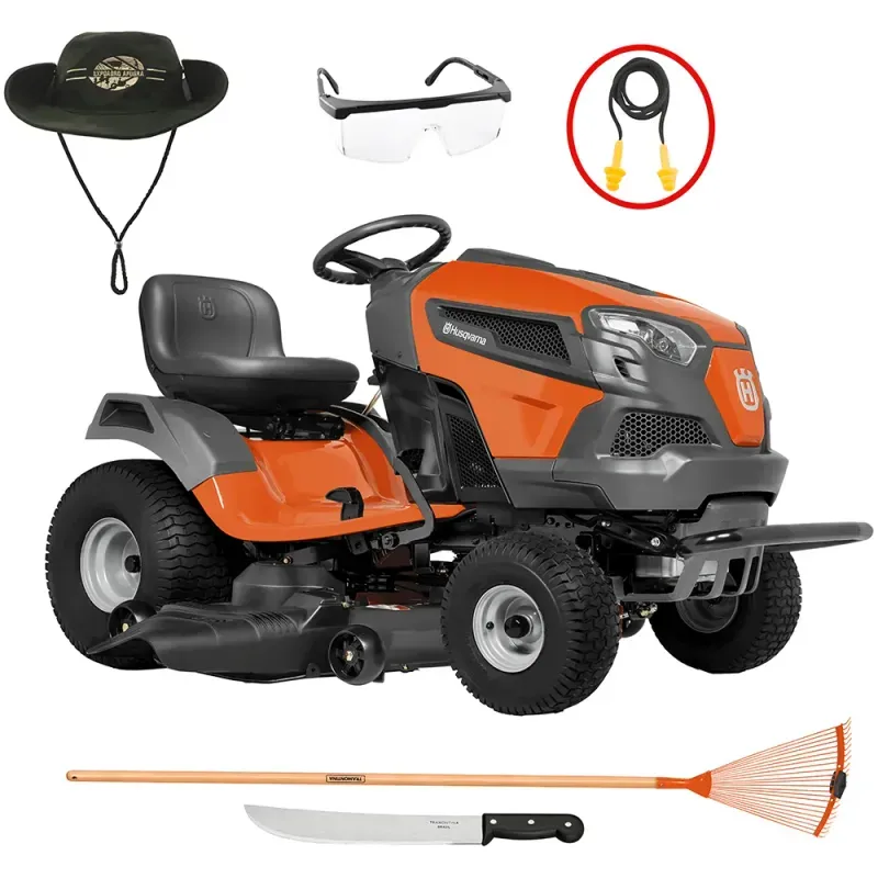 você encontra o Kit com Trator Cortador de Grama Husqvarna TS148, Diâmetro de Corte de 122cm + Chapéu/Óculos/Facão/Protetor Auricular/Vassoura, uma solução completa e prática para quem busca eficiência, segurança e conforto na manutenção de grandes áreas verdes. Este kit foi desenvolvido para atender às necessidades de proprietários de grandes terrenos, clubes, condomínios, parques e propriedades rurais que desejam unir potência, qualidade e segurança em um único conjunto de equipamentos. Fabricado pela Husqvarna, marca reconhecida mundialmente por sua confiabilidade, inovação e durabilidade, o kit combina um trator cortador de grama de alta performance com acessórios essenciais para a proteção e o conforto do operador, garantindo uma experiência de uso completa, eficiente e segura.