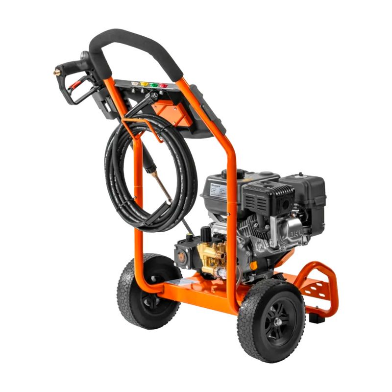 | Diferenciais | Alta Pressão (3000 PSI) – Maior eficiência na remoção de sujeiras pesadas. Motor a Gasolina – Maior autonomia, sem necessidade de energia elétrica. Durabilidade – Estrutura robusta, projetada para uso intenso. Mobilidade Aprimorada – Rodas grandes e design ergonômico para fácil transporte. Versatilidade – Indicada para uso residencial, comercial e agrícola. Bico Ajustável – Controle de intensidade para diferentes necessidades de limpeza. |