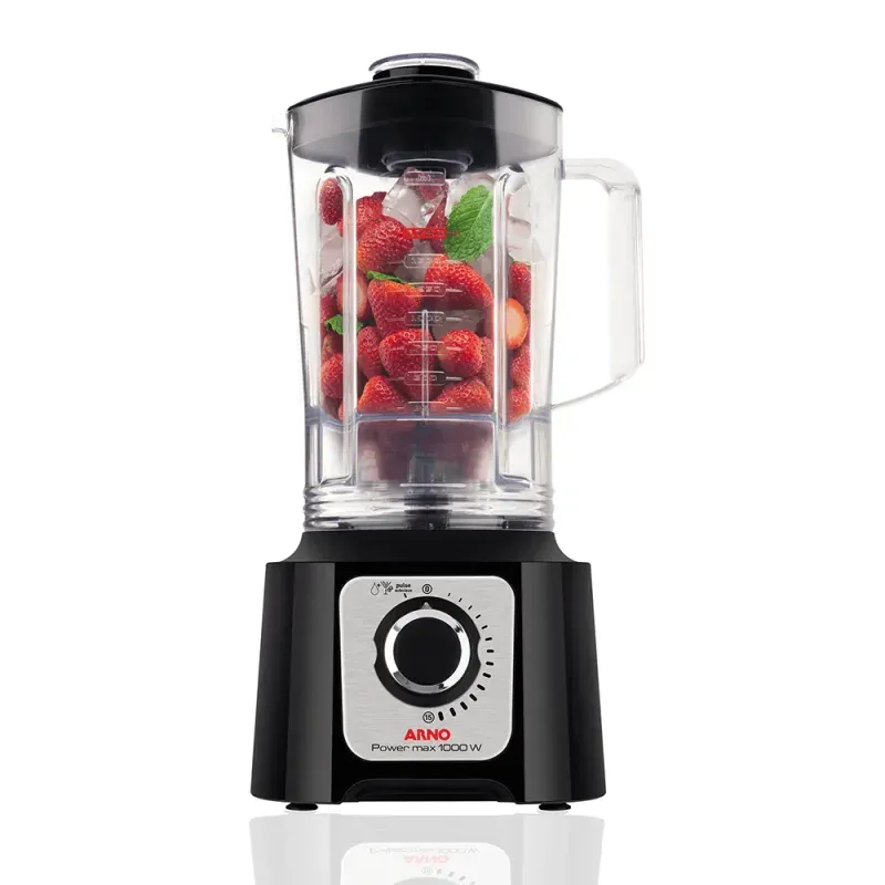 - Ação 1 : Efeito Ciclone, cria uma mistura consistente, homogênea e lisa. - Ação 2: Mistura Total, mistura e tritura todos os tipos de ingredientes. - Ação 3: Tritura Máxima, a garantia que não sobraram pedaços de alimento no fundo da jarra. Com o Arno Power Max 1000 você tem máxima potência, eficiência e design para sua cozinha. |