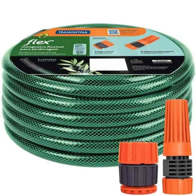 | Conteúdo da Embalagem | 1 Mangueira Tramontina Flex 20 Metros 1 Esguicho com jato regulável 1 Adaptador com engate rosqueado |