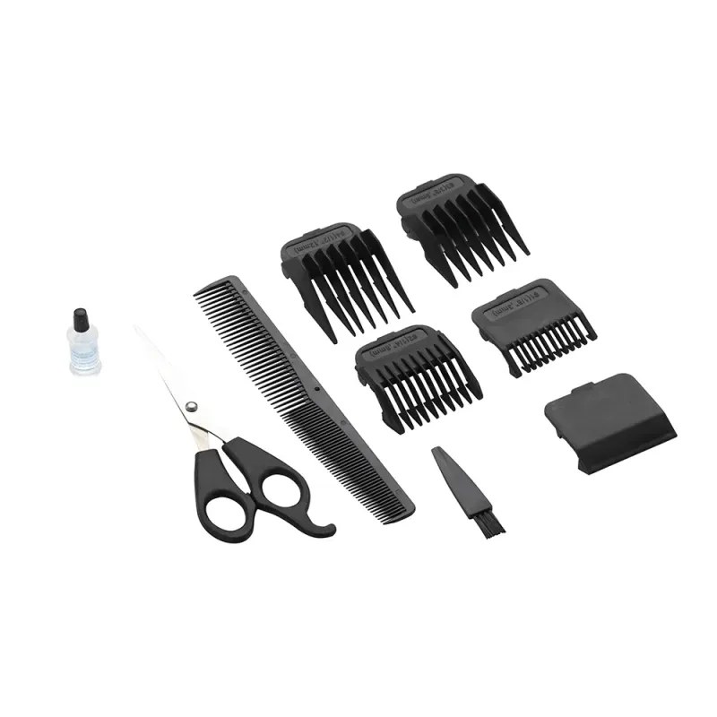 1 Escovinha para Limpeza 1 Pente 1 Recipiente com Óleo Lubrificante 1 Protetor para Lâmina 4 Pentes de Corte: 3mm, 6mm, 9mm e 12mm |