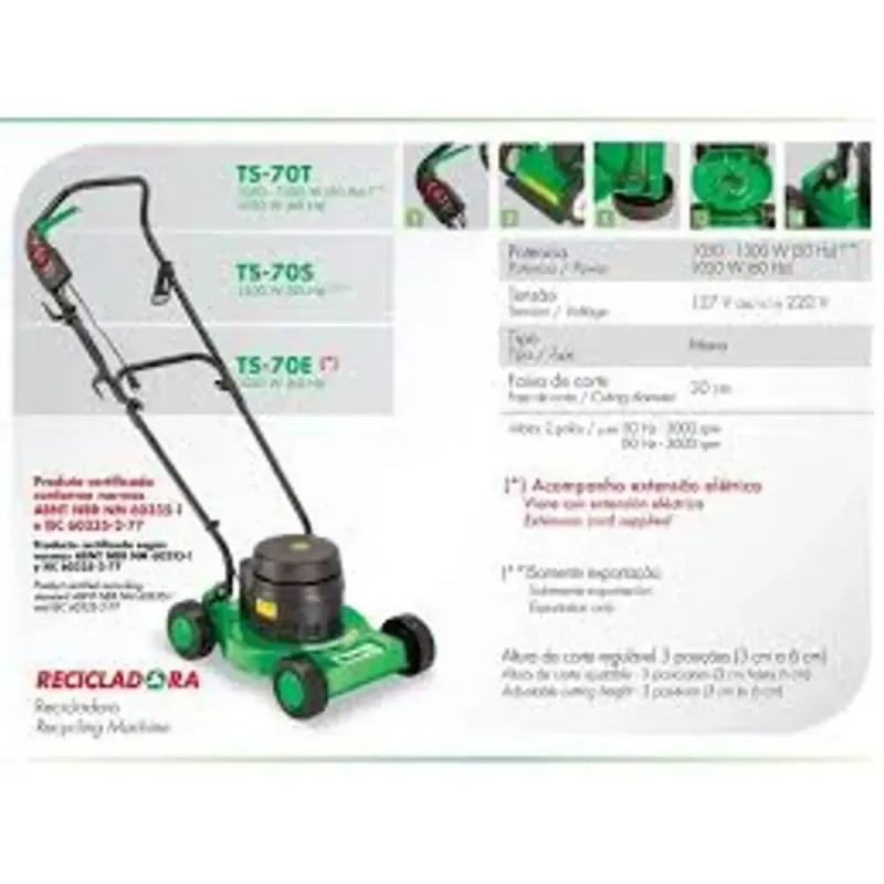 | Diferenciais | - Equipado com Botão Trava de Segurança: Impede o acionamento acidental da máquina, liberando a partida do motor somente quando pressionado. - Chave elétrica interruptora bipolar que permite isolação total, independente da posição do plugue na tomada. - Cabo Ergonômico: Para maior conforto do operador, dobrável, facilitando o transporte e armazenamento. - Trava para extensão elétrica. - Rodas de polietileno de alta densidade. - Motores de indução, monofásicos de 2 polos, instalados num compartimento de polietileno de alta densidade (para proteção contra descargas elétricas). - Base: Em chapa de aço de 1,5 mm de espessura. - Lâmina: Em aço especial, com espessura de 2,35 mm, com têmpera total. - Regulagem de Altura de Corte: Em 3 posições, com variação de 3 a 6 cm (sistema de regulagem de altura por eixo, nas 2 rodas dianteiras e 2 rodas traseiras). - Acabamento: Todas as pecas metálicas recebem tratamento anticorrosivo epintura com tinta a pó de poliéster polimerizado em estufa a 220 °C, garantindo maior durabilidade e acabamento. |