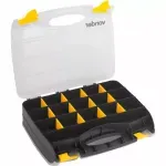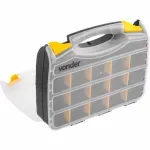 Possui 32 compartimentos com 24 divisões removíveis e adaptáveis, alça para transporte e 4 travas Indicado para acondicionar peças e acessórios, material de pesca, parafusos, pregos, porcas, remédios, entre outros.