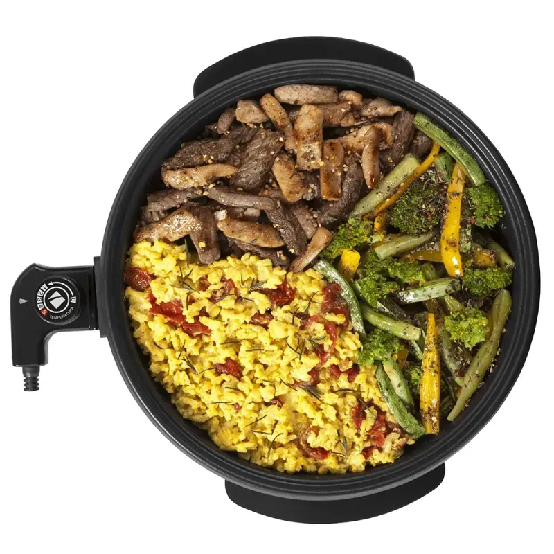 - Tampa em vidro temperado. - Pode ser levado à mesa. - Revestimento antiaderente de qualidade superior. - Pés antiderrapantes. - Multifuncional: assa, frita, cozinha, aquece, grelha, tosta, doura. |