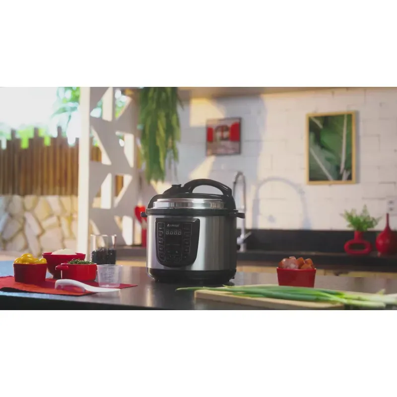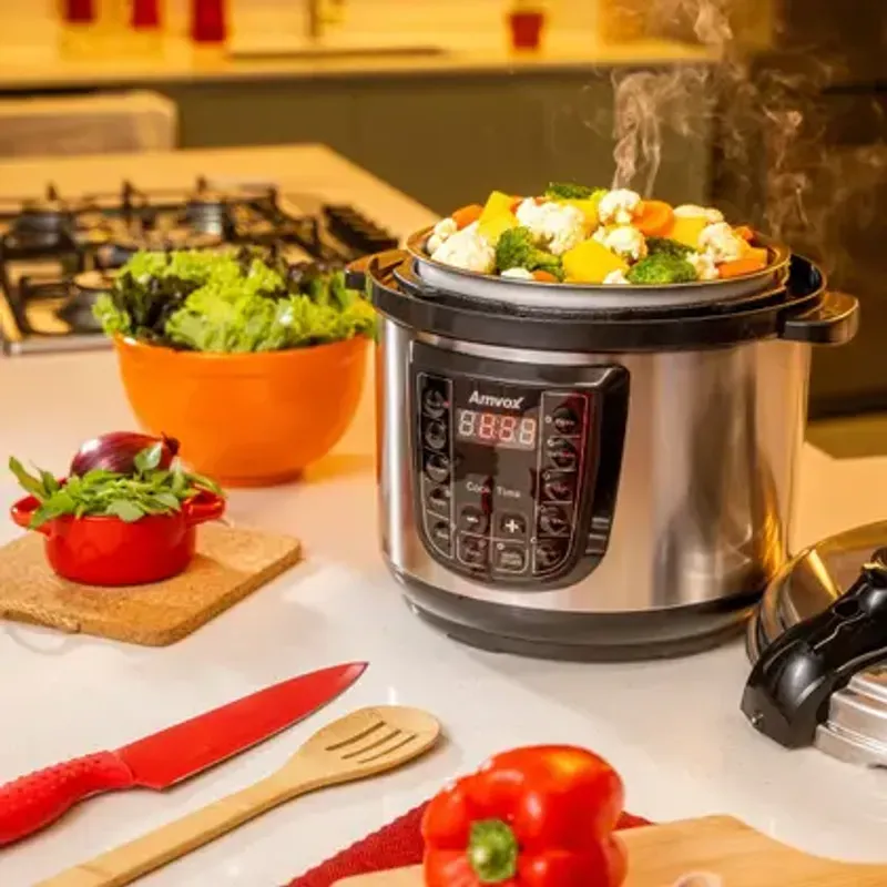 A Panela de Pressão Elétrica Amvox APS050 5L 220V é uma aliada prática e segura para o preparo de refeições no dia a dia. Com capacidade de 5 litros e potência de 900W, ela permite cozinhar diversos alimentos com rapidez e eficiência. Seu painel digital facilita a seleção de funções e o acompanhamento do processo de cozimento. Além disso, conta com revestimento antiaderente, que evita que os alimentos grudem e facilita a limpeza. O sistema de segurança com trava e desligamento automático proporciona tranquilidade durante o uso.