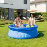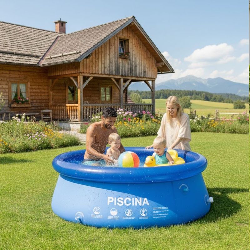 PVC de alta resistência com tripla camada para maior durabilidade. O sistema de montagem é simples: basta inflar a borda superior e encher com água – a piscina ganha forma automaticamente conforme o nível da água sobe. Por não possuir quinas ou partes metálicas, oferece um ambiente de banho suave e seguro para as crianças, sendo muito fácil de guardar após o esvaziamento.