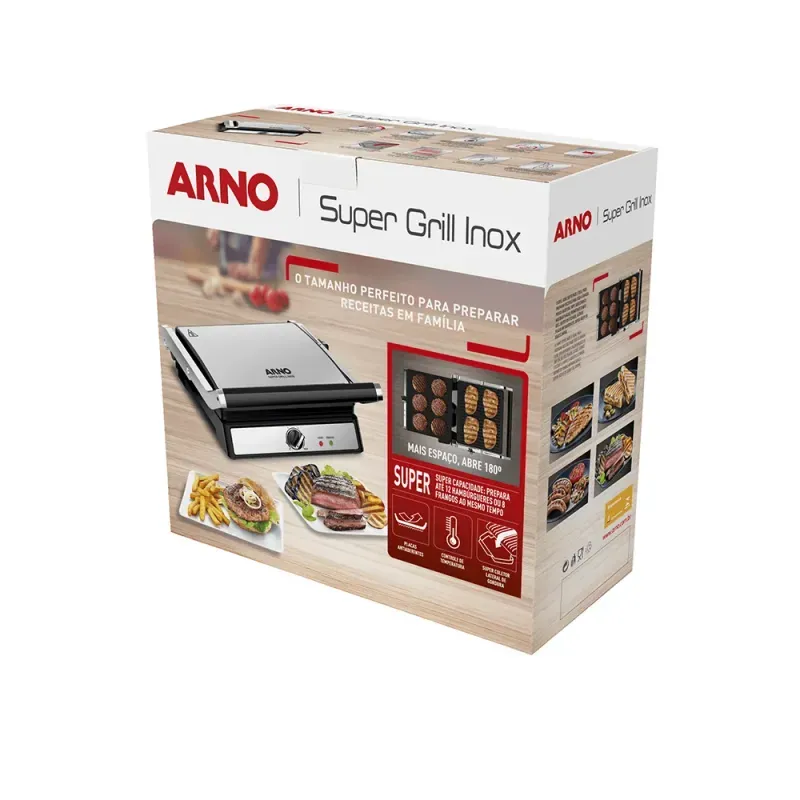 | Diferenciais | O Super Grill Arno Inox é ideal para preparar receitas para toda a família e amigos por conta de sua super capacidade. Com sua abertura de 180° e aquecimento nas duas placas você pode usar o aparelho aberto ou fechado facilitando o uso e ajudando a chegar no resultado perfeito. |
