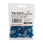 Esse modelo possui isolação em PVC na cor azul, que além de identificar a bitola do cabo, protege contra choques acidentais e facilita a instalação. É compatível com cabos de 1,5 a 2,5 mm² e suporta correntes de até 27 amperes, sendo adequado para uso residencial, automotivo, industrial e em painéis elétricos.