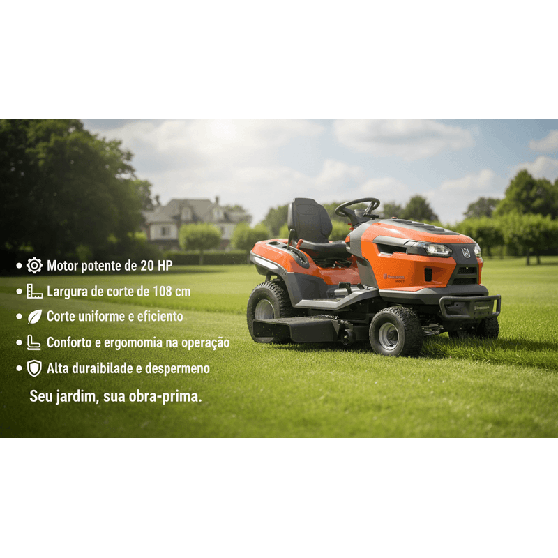 O Trator Cortador de Grama Husqvarna TS 217TM é a solução ideal para a manutenção de grandes gramados, oferecendo potência e robustez para longas jornadas. Seu motor de 20 HP e o deck de corte de 108 cm com sistema Air Induction garantem um corte preciso e uniforme. A transmissão manual de alta confiabilidade e a estrutura reforçada asseguram durabilidade e desempenho consistentes. Projetado para o conforto do operador, possui assento ajustável e ergonômico, comandos de fácil acesso e faróis potentes para uso em diversas condições, com um raio de giro reduzido que facilita manobras eficientes.