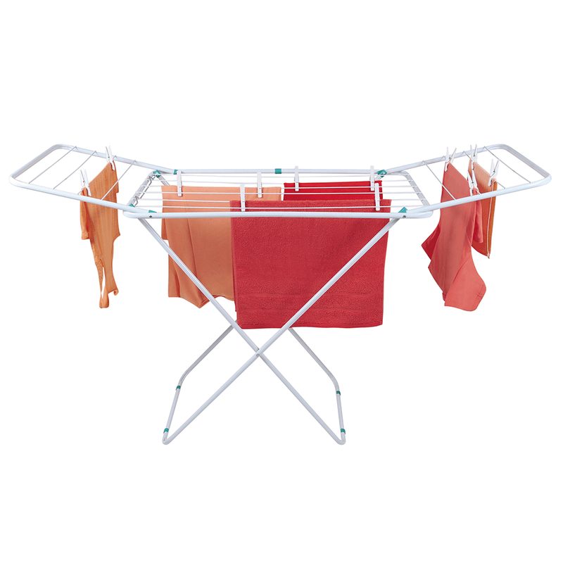 - Ideal para quem busca praticidade e qualidade em um mesmo produto, o Varal de Chão com Abas otimiza seu espaço distribuindo seis varetas no centro e duas abas com quatro varetas cada com capacidade para até 16 Kg de roupas. |